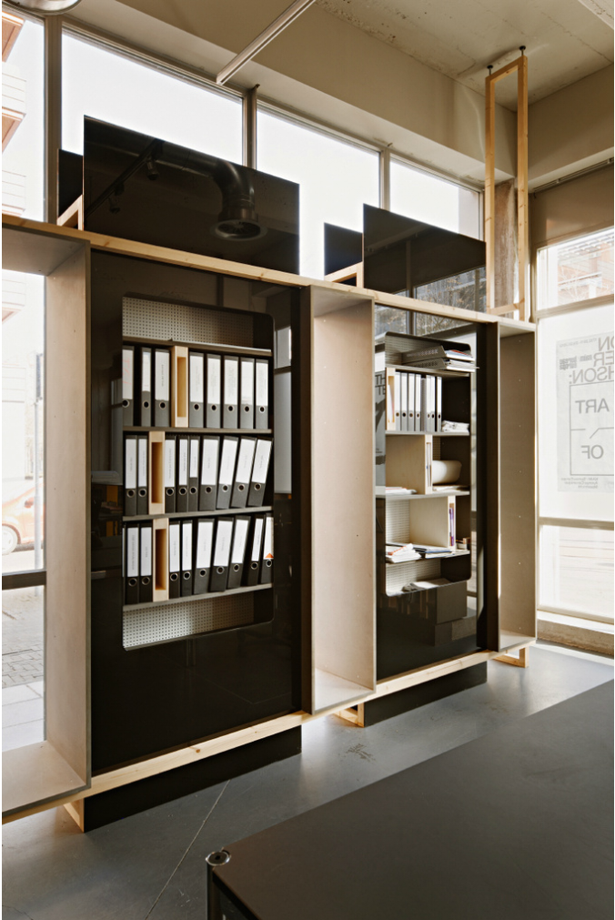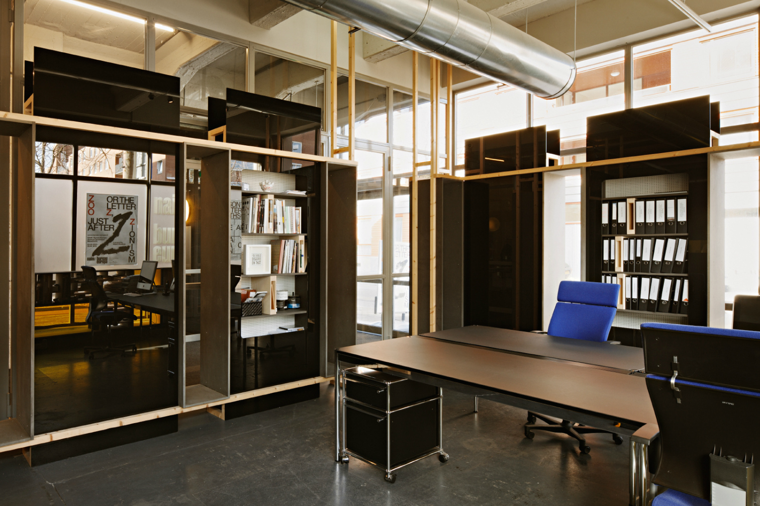 De kantoorinrichting van Buro Europa te Maastricht, deels hergebruik materialen deels nieuw.